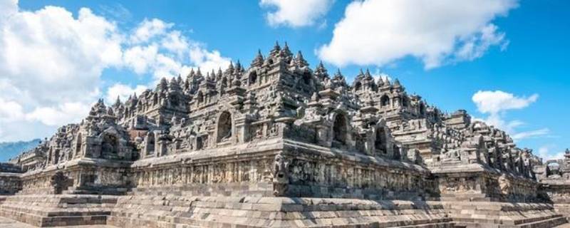 婆罗浮屠在印度尼西亚,大约建于公元750年至850年间,由当时统治爪哇岛的夏连特拉王朝统治者兴建。“婆罗浮屠”这个名字的意思来自梵语“Vihara Buddha Ur”,意思是“山顶的佛寺”。公元1006年因火山喷发而被埋入地下。一直到806年后的1812年被英国人莱佛士发现,婆罗浮屠得以重见天日。