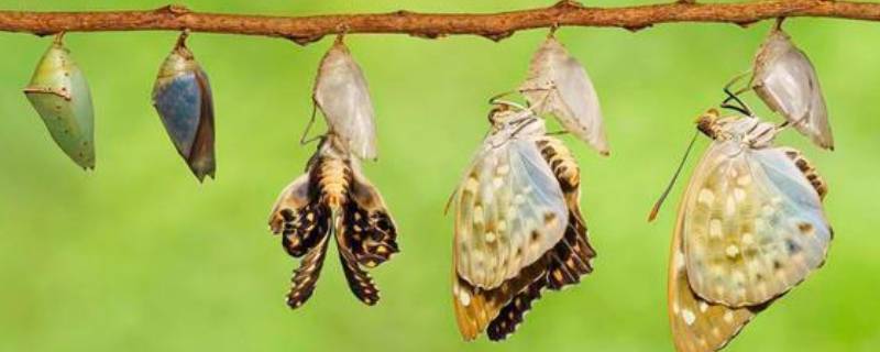 蛹变蝴蝶时先从头部开始,在胸腹部涨裂开一口子,头部从口子中钻出,然后胸、腹、尾依次钻出。在钻出的最初,身体较弱,翅膀也折叠着,但不久即翅膀伸展张开,身体也硬朗起来,成为真正的蝴蝶。