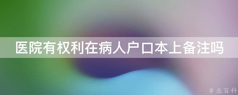 医院没有权利在病人户口本上备注。户口本是由公安机关负责管理和发放的,医院无权干涉或更改户口本上的任何信息。如果医院要求病人在户口本上备注某些信息,这可能会对病人的隐私和权益造成侵犯。