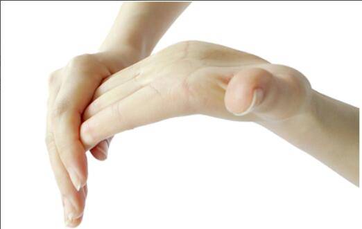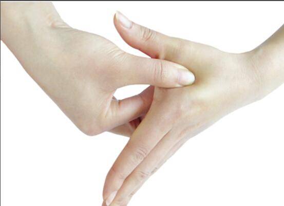 3、找到左手的大拇指和食指间陷进去的部位,用右手旋转揉捏,两手交替动作各30秒。