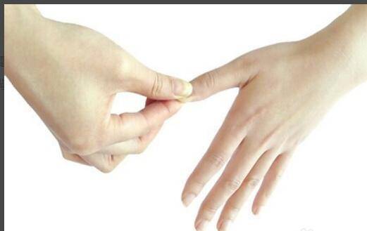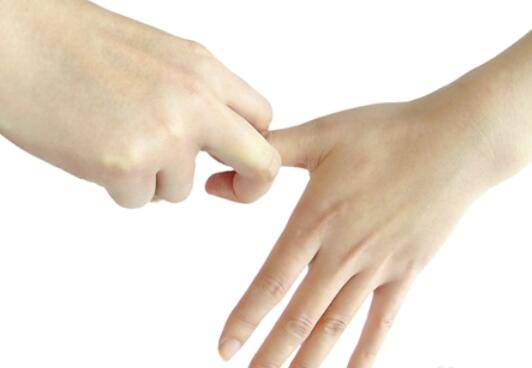 4、将右手的食指和中指弯曲,夹住左手的每一根手指,在侧面上下滑动10次左右,然后两手交替动作。