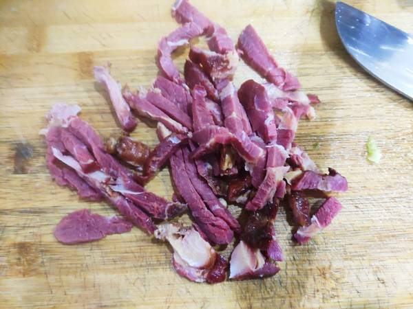 1、食材准备:熏马肉150克、茶干50克、青椒半个、盐1克、料酒5克、蚝油5克、油适量、姜丝2克。