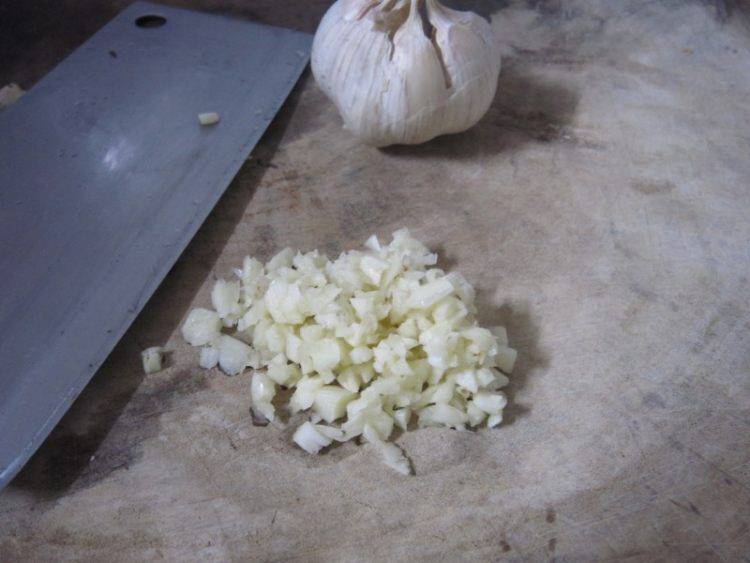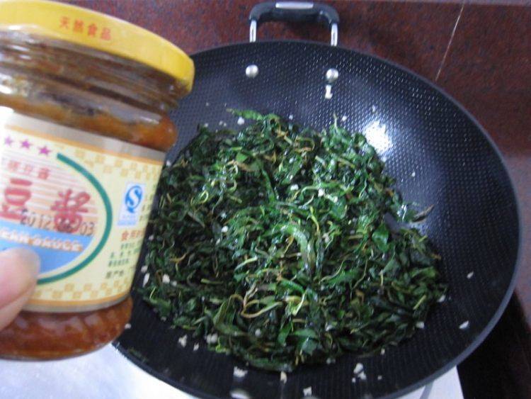 8、炒两分钟后把麻叶推到四周,加入油,蒜末。