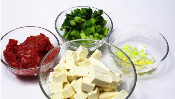 用料:豆腐1块、牛肉200克、青蒜苗50克、辅料郫县豆瓣酱20克、葱10克、蒜10克、姜10克、花椒5克、辣椒粉5克、豆豉10克。