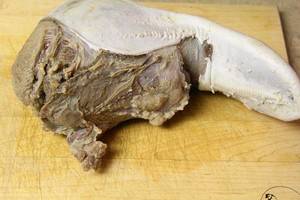 3、将牛舌捞出,过凉水,扒掉白色的皮。