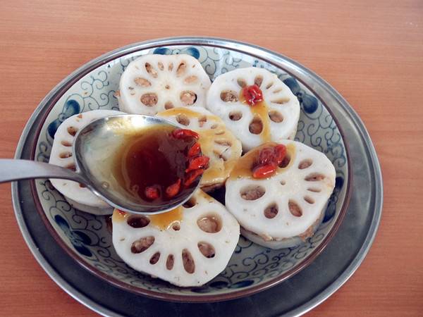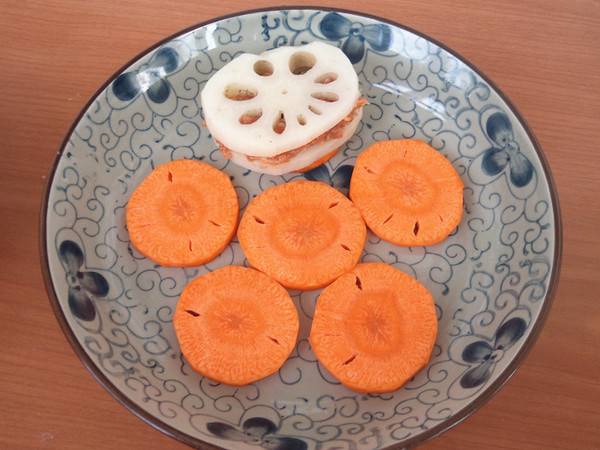 1、准备材料:藕夹6个、盐适量、白糖适量、 生抽适量、枸杞5克、胡萝卜50克。
