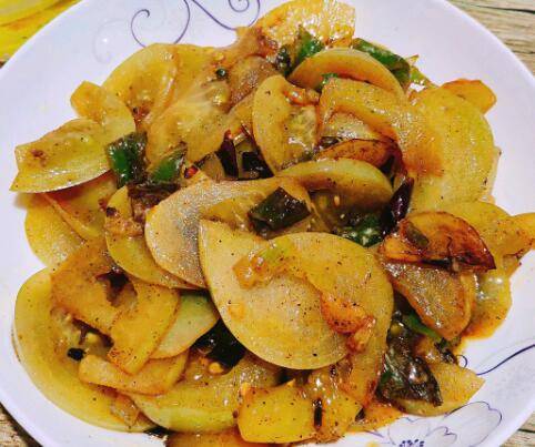 2、西红柿入锅翻炒,下入各种调料,翻炒至熟即可出锅。
