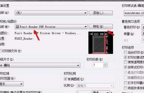 在打印机名称一栏选择foxit reader pdf printer,点击特性。