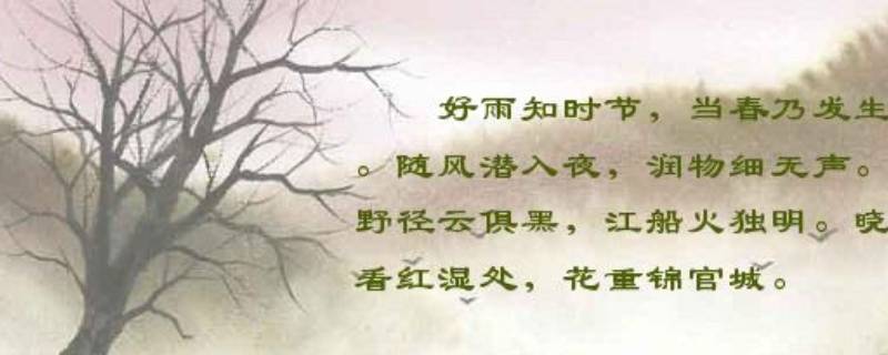 好雨知道下雨的节气,正是在植物萌发生长的时候,它随着春风在夜里悄悄地落下,悄然无声地滋润着大地万物。雨夜中野外黑茫茫,只有江船上的灯火格外明亮。天亮后,看看这带着雨水的花朵,娇美红艳,整个锦官城变成了繁花盛开的世界。