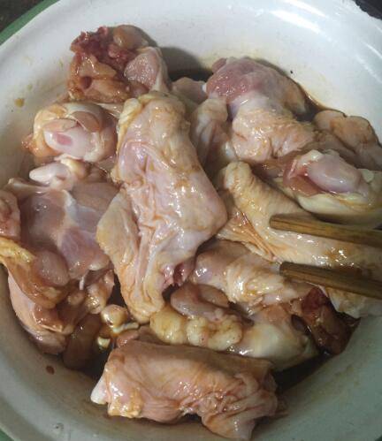 2、洗净的鸭翅根从中间剁开,过下热水,焯去血沫,葱切段、姜切片。
