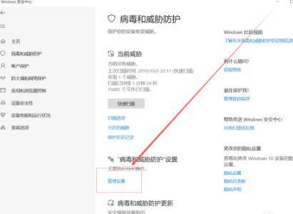 打开之后,就会出现病毒和威胁防护,在这个页面中可以看到杀毒软件的检测次数和杀毒情况,点击管理设置。