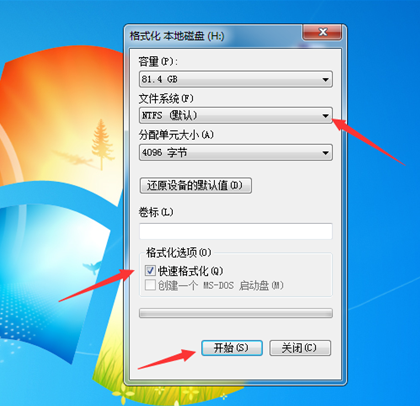 3、接着在弹出的窗口中,设置好格式,然后勾选“快速格式化”,再点击“开始”。