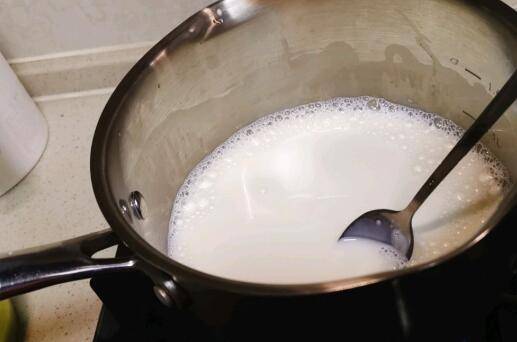 牛奶加炼乳,放入奶锅,小火煮到微微冒泡。