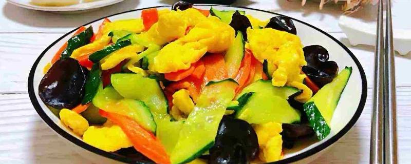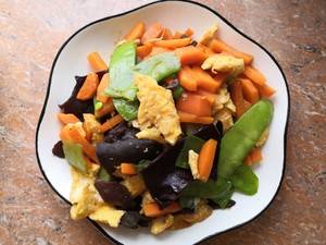 用料:荷兰豆200克、胡萝卜1根、木耳3朵、鸡蛋3个、盐5克、生抽2勺。