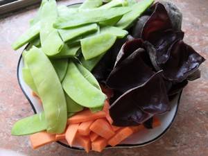 3、木耳荷兰豆胡萝卜洗干净切好。