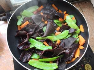 4、热油下锅,胡萝卜翻炒几分钟,陆续下木耳和荷兰豆,炒熟放盐和生抽调味。