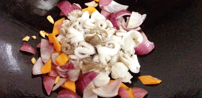 5、下入八爪鱼翻炒几下,加入圆葱。