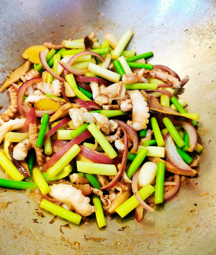 3、热锅放入植物油,油热后放入姜片和蒜片,出香后放入香菇,洋葱,蒜苗大火翻炒均匀。菜变色后放入八爪鱼迅速翻炒。