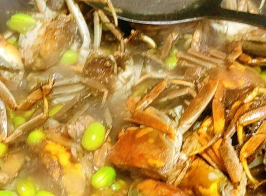 河蟹5只、姜3片、毛豆半碗、面粉适量、葱1段、生抽2勺、白糖半勺、食用油适量、清水适量、胡椒粉适量、料酒1匙、盐1小匙。