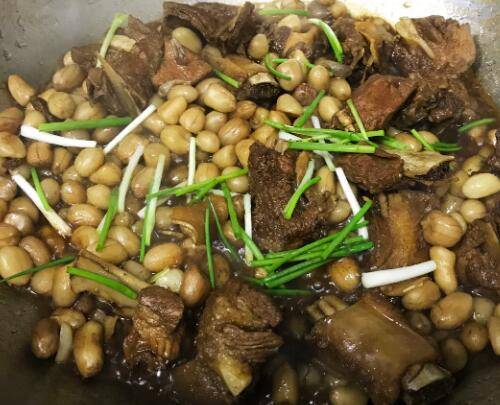 放入花生米,转小火慢煮,一直煮到水差不多收干。