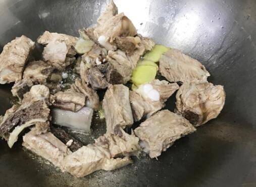 起油锅,放入姜片,再放入细砂糖、排骨,进行翻炒。