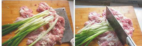 新鲜猪肉一块,洗净去皮备用,大葱择洗干净备用,将猪肉切小块,用刀慢慢剁碎。