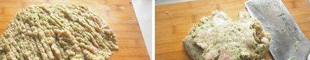 将拍扁的大葱剁入肉里,同时加入姜一起剁馅,将葱姜慢慢剁融合于肉里,为了保持剁的均匀,剁好一面,用刀把下面的翻过来继续剁,如此往复,将肉馅剁细腻即可。