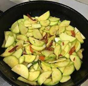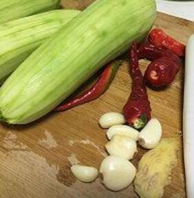 用料:青椒、花生油、盐、鸡粉、茭瓜2~3根、蚝油、花椒、葱姜蒜、干辣椒、料酒、醋。