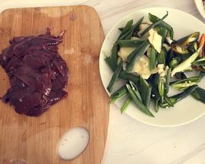 1、准备材料:牛肝1块、蒜2瓣、青辣椒5个、姜4片、大葱1根、料酒3勺、淀粉1勺、生抽4勺。