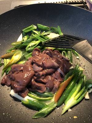 5、再放入牛肝,炒至半熟,加生抽爆炒。