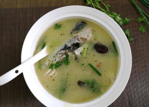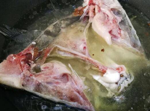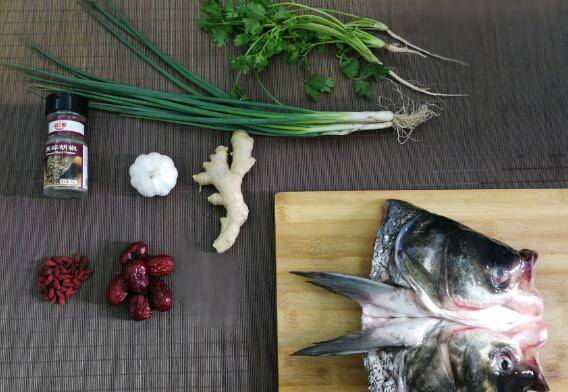 用料:大头鱼鱼头1个、姜片适量、蒜适量、葱2根、油15毫升、盐小半勺、黑胡椒小半勺、热水、枸杞适量、大枣5颗。