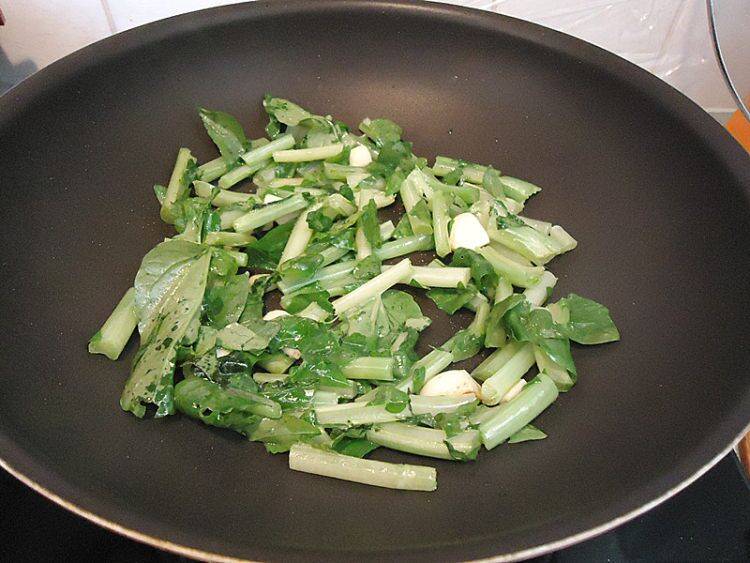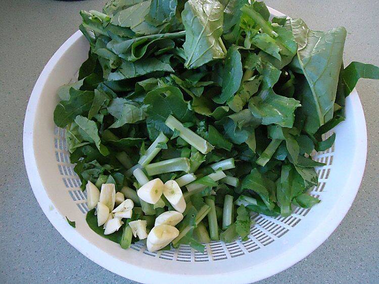 2、萝卜叶子洗干净切段,将叶子与梗分开,蒜头剁碎。