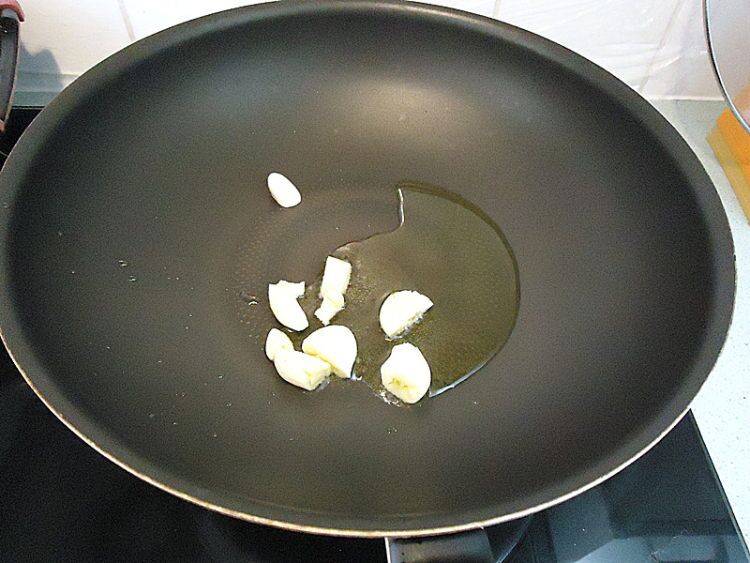 3、烧热锅倒入橄榄油放入蒜头爆香。