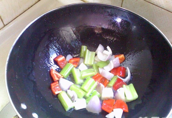 4、洋葱、芹菜、红椒、姜切块,倒入锅中炒1-2分钟。