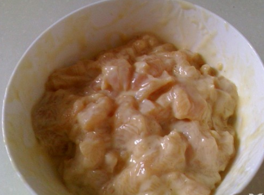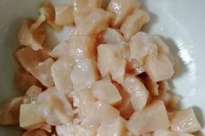 2、鸡脯肉切块,加入鸡蛋、面粉、淀粉、水、鸡粉、食盐拌匀腌制15分钟。
