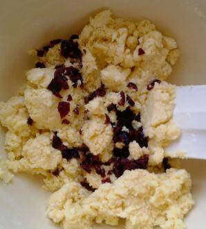 4、再加入蔓越莓干,用橡皮刮刀翻拌均匀,和成一个面团。