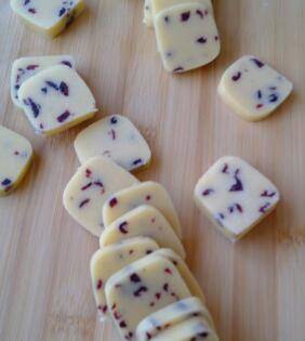 5、将面团整理成长条状,放入冰箱冷冻四十分钟。取出,切成八毫米的片状。
