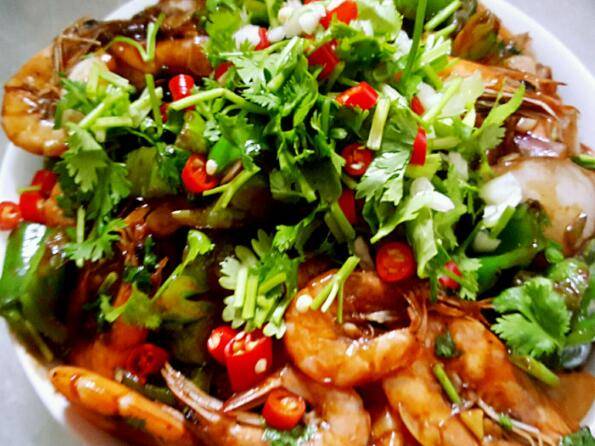 虾500g、青椒2个、洋葱小半个、大葱适量、大蒜1个、香菜适量、小米辣3个、干辣椒段适量。