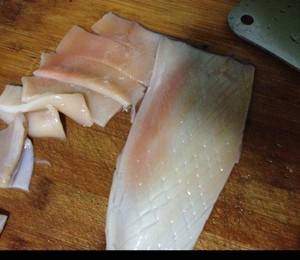 3、把鱿鱼皮扒开去掉,在鱿鱼肚子上轻轻用刀斜着划痕,鱿鱼须切段。