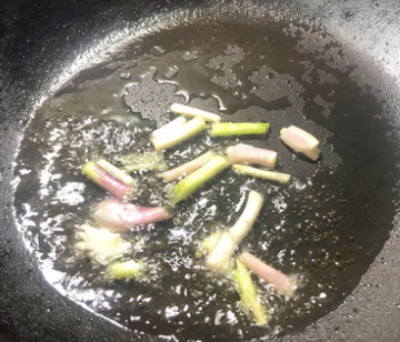 4、热锅倒入食用油,油温升高时倒入葱梗煸出香味。