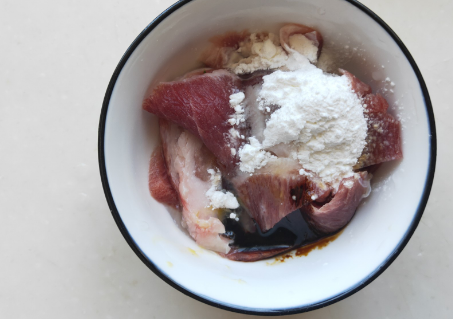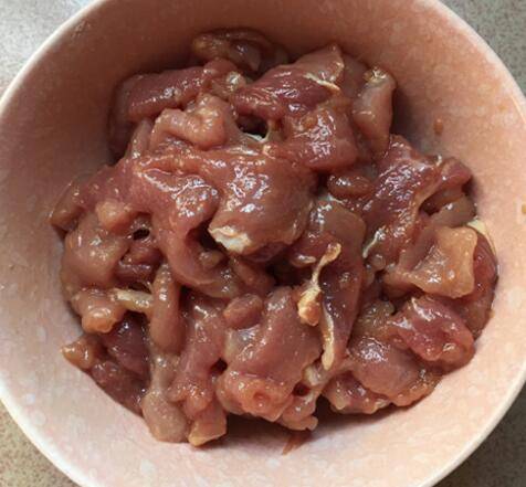 2、瘦肉洗净切片,调酱油、鸡粉、料酒搅拌均匀腌制片刻,然后再加入少许淀粉抓匀,最后滴几滴食用油拌匀。