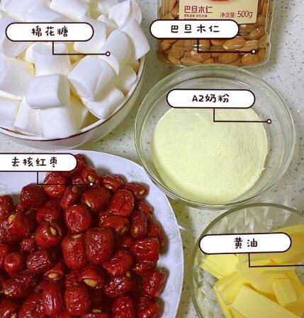 红枣160颗、黄油75克、棉花糖400克、巴旦木仁160颗、无糖奶粉(炒奶粉用)110克、无糖奶粉(裹奶粉用)适量。