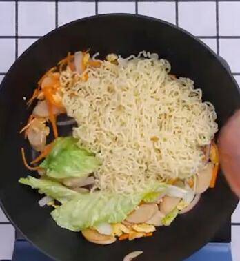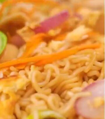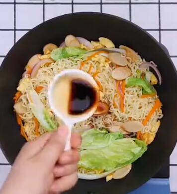 主料:泡面饼1包。辅料:火腿1根、洋葱50克、青菜30克、胡萝卜30克、老抽8克、生抽8克、鸡粉5克。