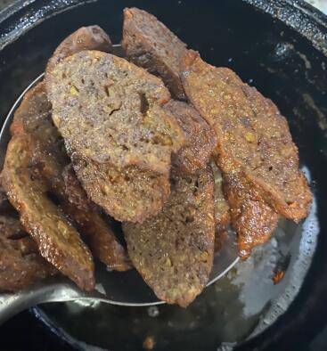8、取出摆放盘中晾凉,吃的时候取一块斜刀切一厘米厚片。