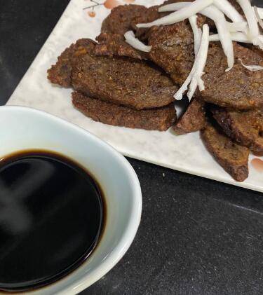 9、老陈醋来一碟,蘸着外焦里嫩的烧肝食用即可。