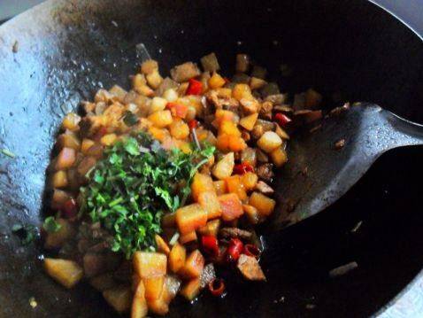 6、放入萝卜丁加盐翻炒片刻,加小半碗水炖一下。