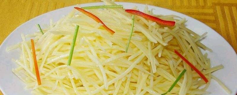 清水500毫升,大火煮沸,倒入土豆丝,焯水30秒。