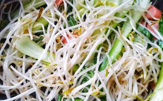 鸡蛋煎熟铲小块,火腿+葱段煎香,放入豆芽和上海青炒软。