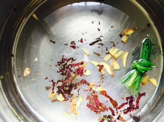 5、蒸锅中放水,加入些紫苏末、姜末、一个葱节,再加2勺料酒。