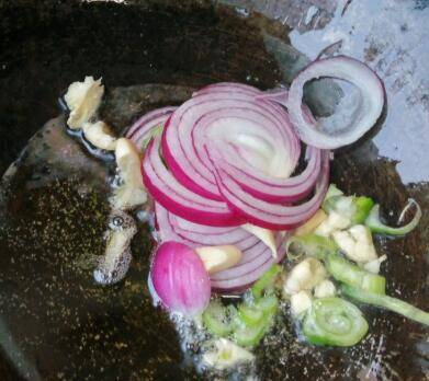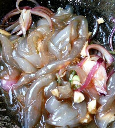3、葱蒜洋葱炝锅,放入拉皮,倒入醋两勺,糖两勺,生抽一勺,翻炒散开。